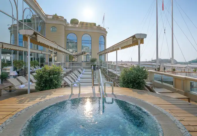 Thermes Marins Monte-Carlo features a splendid pool with a superb view of the Mediterranean.